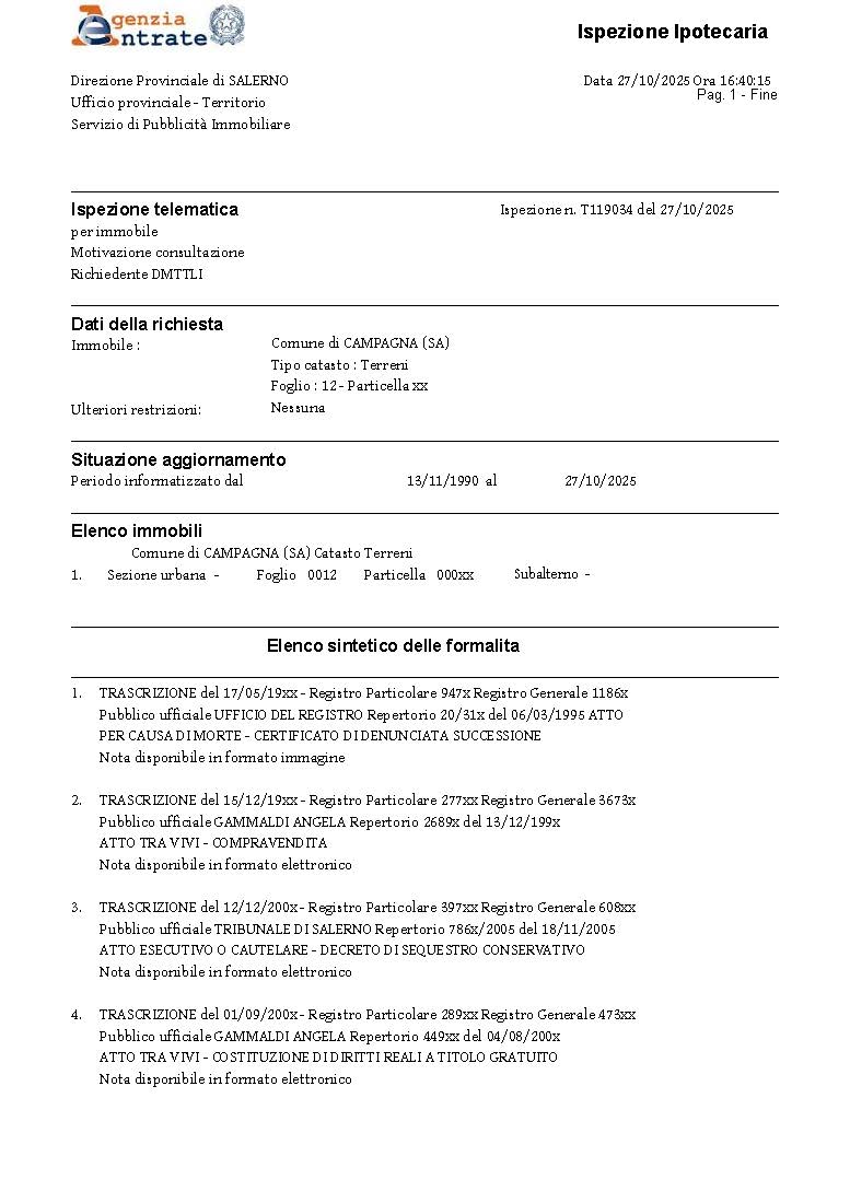 La visura ipotecaria è riferita ad una sola sede provinciale della Conservatoria e del Catasto e riporta dati relativi al periodo successivo alla informatizzazione degli atti in Conservatoria, avvenuta nel 1975.