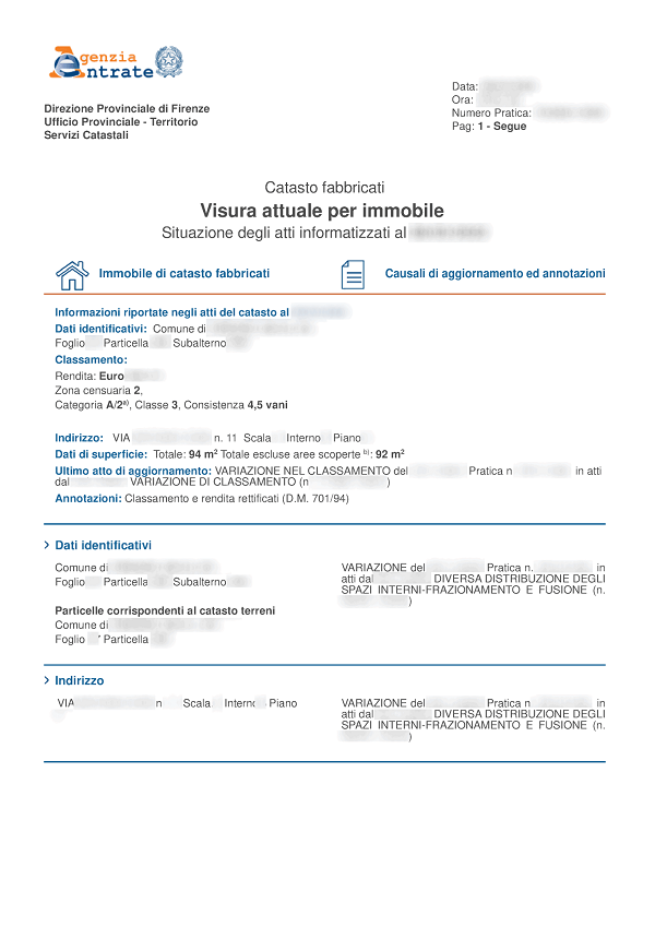 La visura catastale IMU TARI e TASI riporta i dati catastali dell'unità immobiliare con evidenziati i dati identificativi dell'immobile quali: sezione urbana, foglio, particella o mappale, subalterno, classe e categoria catastale, numero di vani e superficie catastale. Ai fini del pagamento delle imposte e tributi IMU, TARI e TASI, il valore di riferimento è la rendita catastale per i fabbricati e il reddito dominicale e agrario per i terreni.