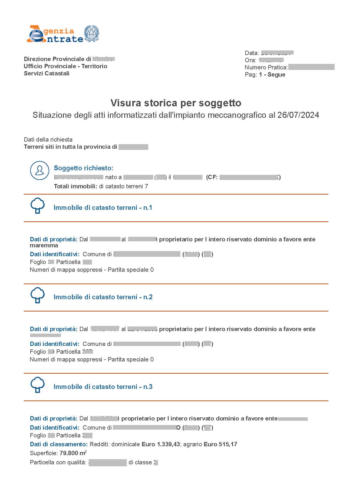 La Visura Catastale Storica Persona Fisica contiene lo stato attuale e lo storico di tutti gli immobili, terreni e fabbricati, intestati ad una persona presenti al catasto