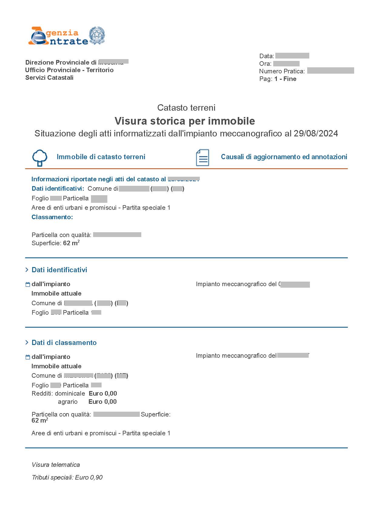 Evidenzia le variazioni registrate in Catasto dal 1980 riferite ad un immobile, terreno o fabbricato. La visura individua anche tutti i precedenti intestatari dell'immobile con le relative quote. CONSEGNA IN POCHI MINUTI IVA compresa