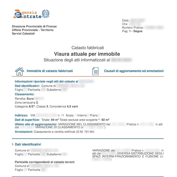La visura catastale immobile contiene i dati del proprietario dell'immobile, terreno o fabbricato, la natura e quota dei diritti reali e i dati catastali completi CONSEGNA IN POCHI MINUTI € 6,40 + € 1,41 (IVA) =