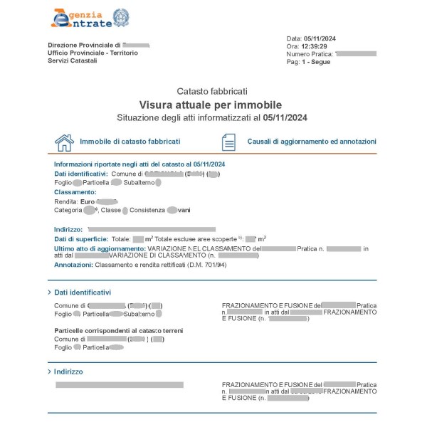 La Visura Catastale analitica contiene le informazioni di un fabbricato o di un terreno registrate nell'archivio del Catasto, il documento ha natura descrittiva CONSEGNA IN POCHI MINUTI IVA compresa