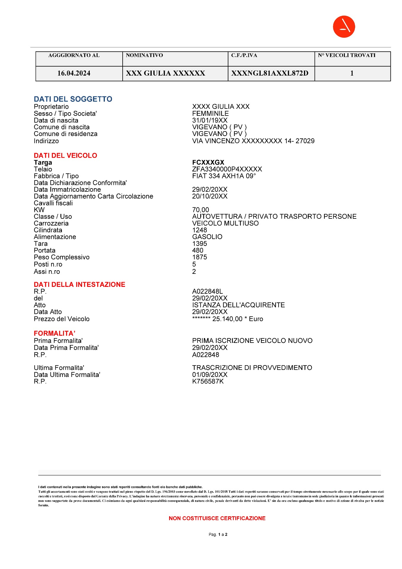 Il servizio prevede la consegna dei dati completi e della Visura PRA targa fino ad un numero massimo di 2 veicoli. Oltre, verrà consegnato un elenco di tutti i veicoli con la sola indicazione della targa.